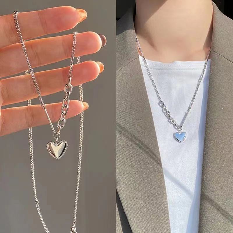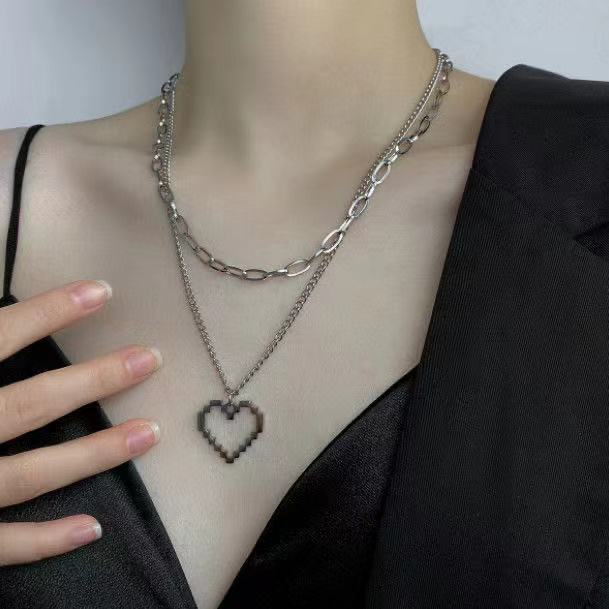 Ins小衆モザイク愛二重ネックレスデザイン冷たい風個性百合シンプルハート形ペンダント女