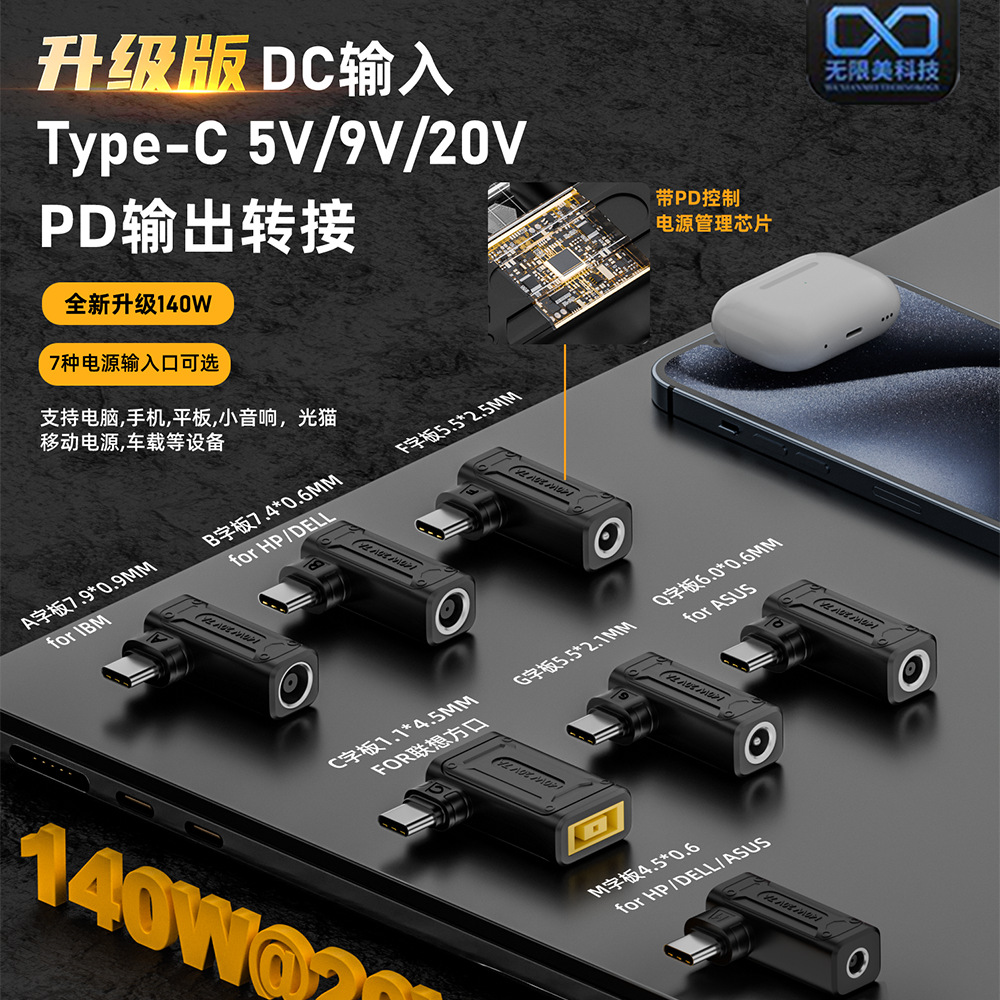 Pd誘導アダプタdc変換type-c公自動識別電圧5v/9v/20vノート電源140w