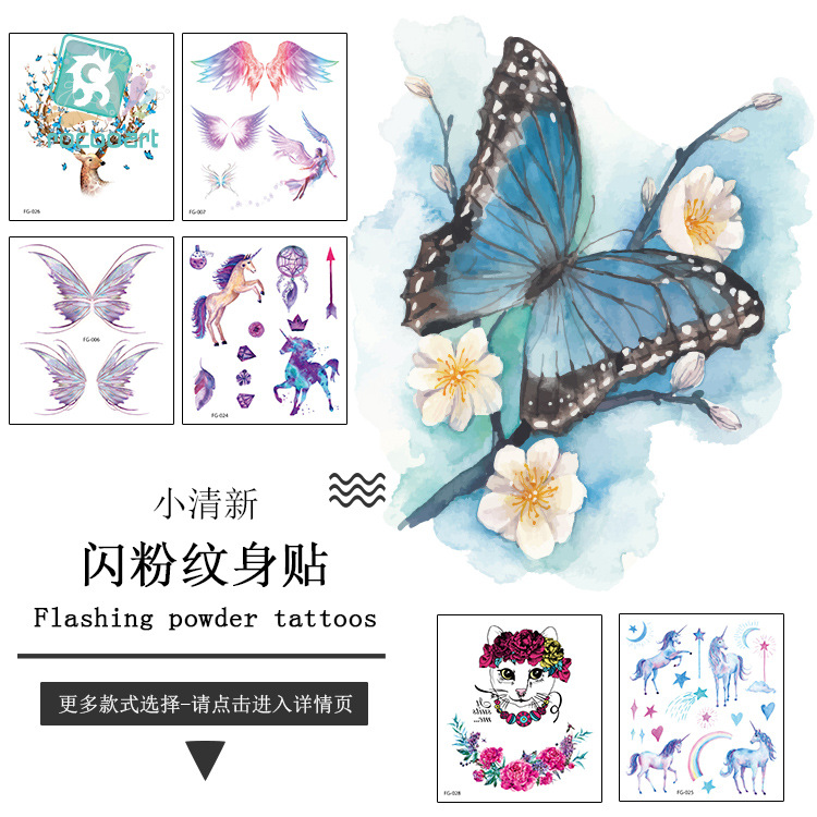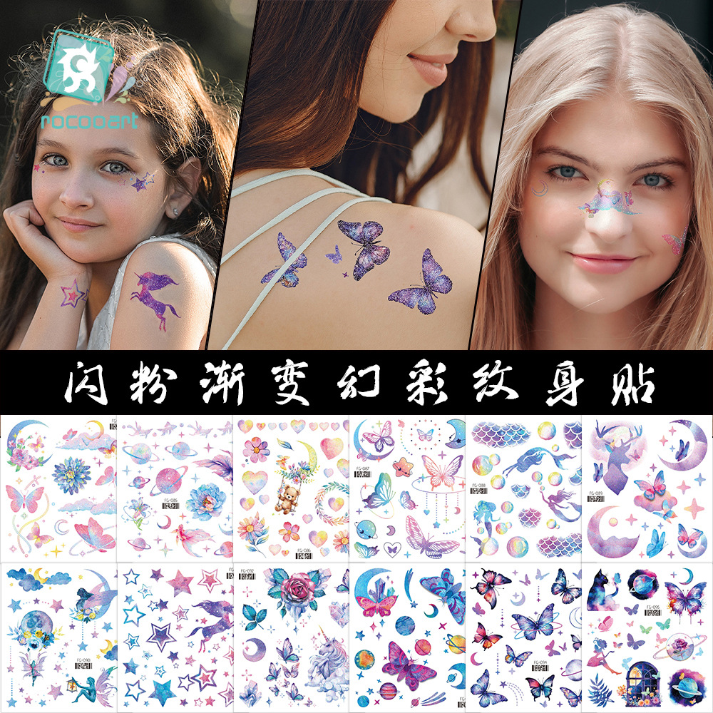 瑞卡竜防水小清新閃粉蝶紋身貼りグラデーションユニコーン刺青シール臨時文体