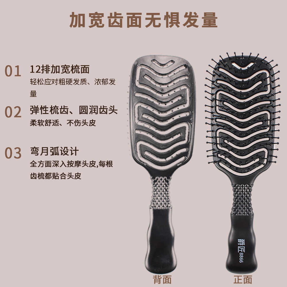 玉源の透かし彫りの順髪櫛8866項の大きい背中の順髪の曲げの櫛の滑り止めの取っ手の透かし彫りの設計は均一で放熱の櫛です。