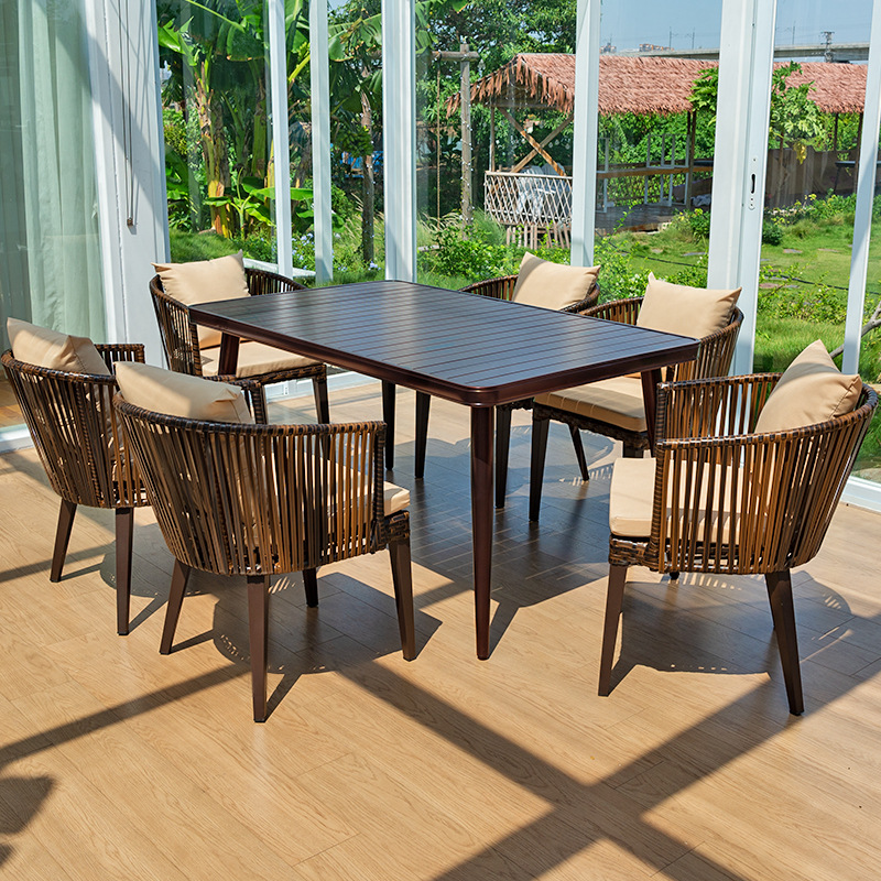 屋外藤編みテーブルと椅子の組み合わせ高級庭園家具ガーデンソファ藤椅子ベランダ柚木ロングテーブルチェア商用