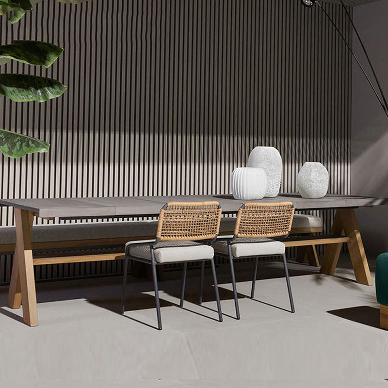 北欧風屋外テーブルと椅子、中庭家具、バルコニー用チーク材籐椅子3点セット、屋外カフェ用籐製ダイニングチェア、籐工芸