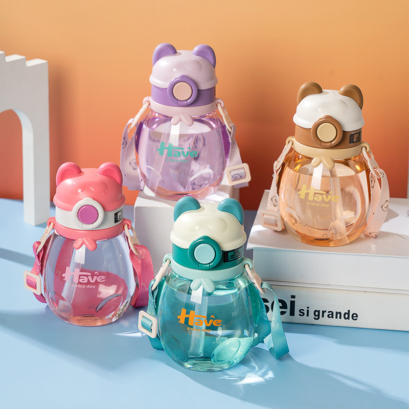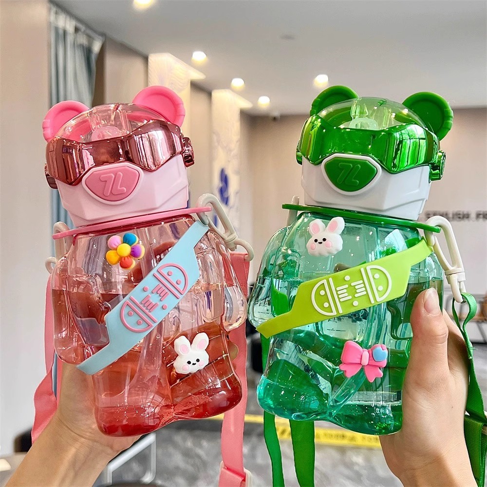 漫画の熊のかわいいコップの大容量の耐落下ストローは斜めにネットの赤いプラスチックのコップをショルダーすることができます。