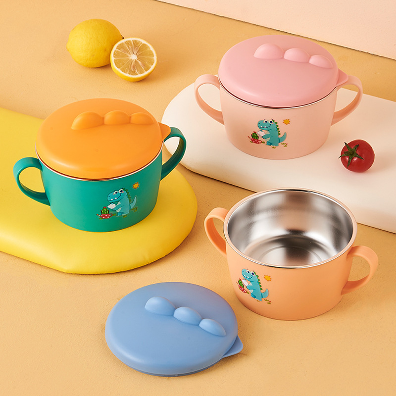 新型ステンレス子供碗漫画双柄蓋付きスプーン茶碗赤ちゃん補助食器子供転倒防止アイロン