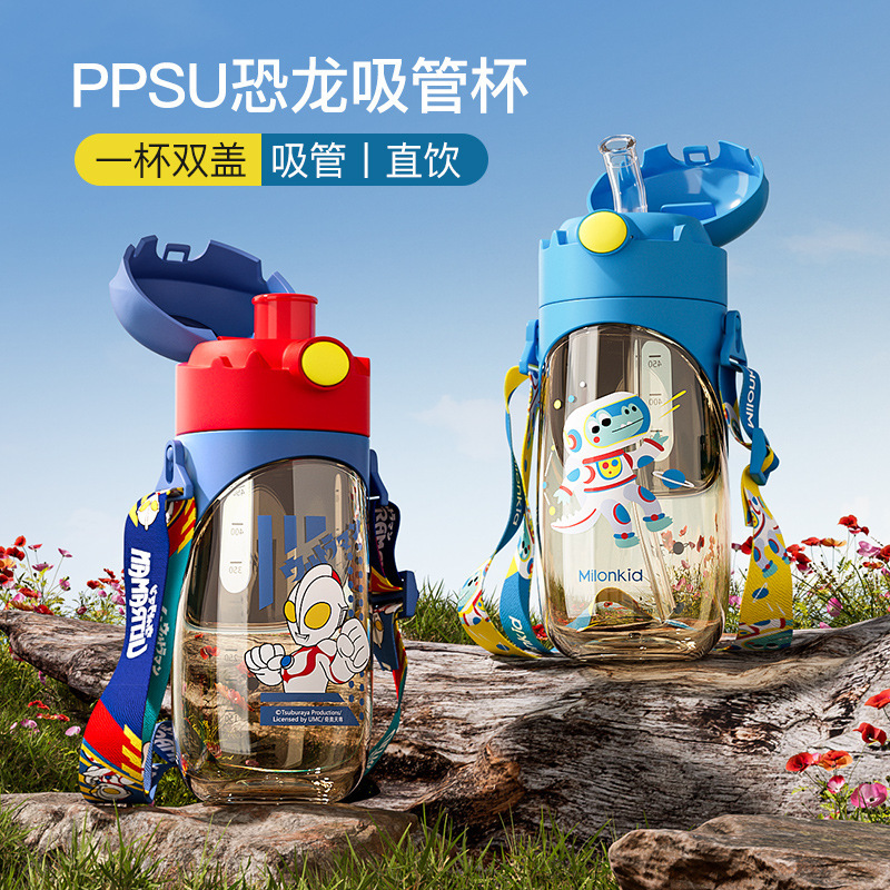 子供用コップ夏の男の子と女の子は学生専用の耐落下ppsuにストローを持って外出します。