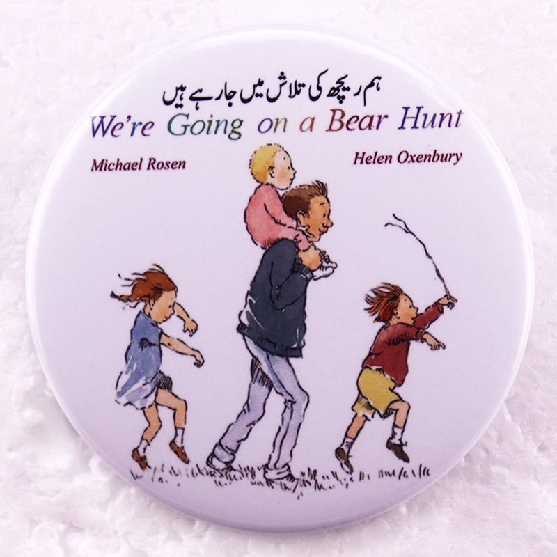 本は熊のブリキバッジのピンを捕まえに行きます。