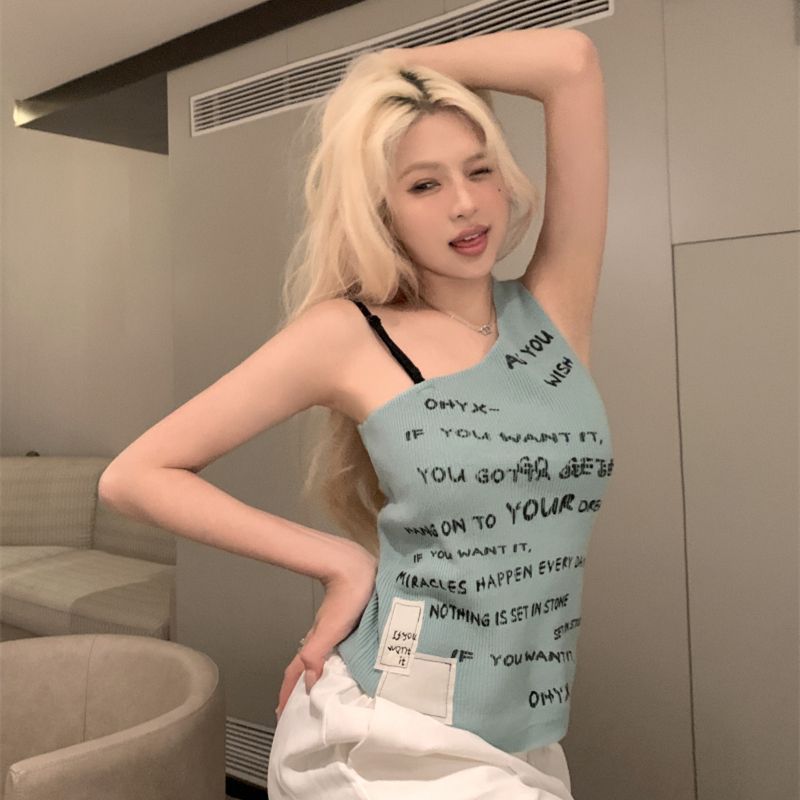 ファッショナブルなレタープリントワンショルダースラントカラーベスト女性用夏甘辛セクシースリムフィット万能ショートトップ