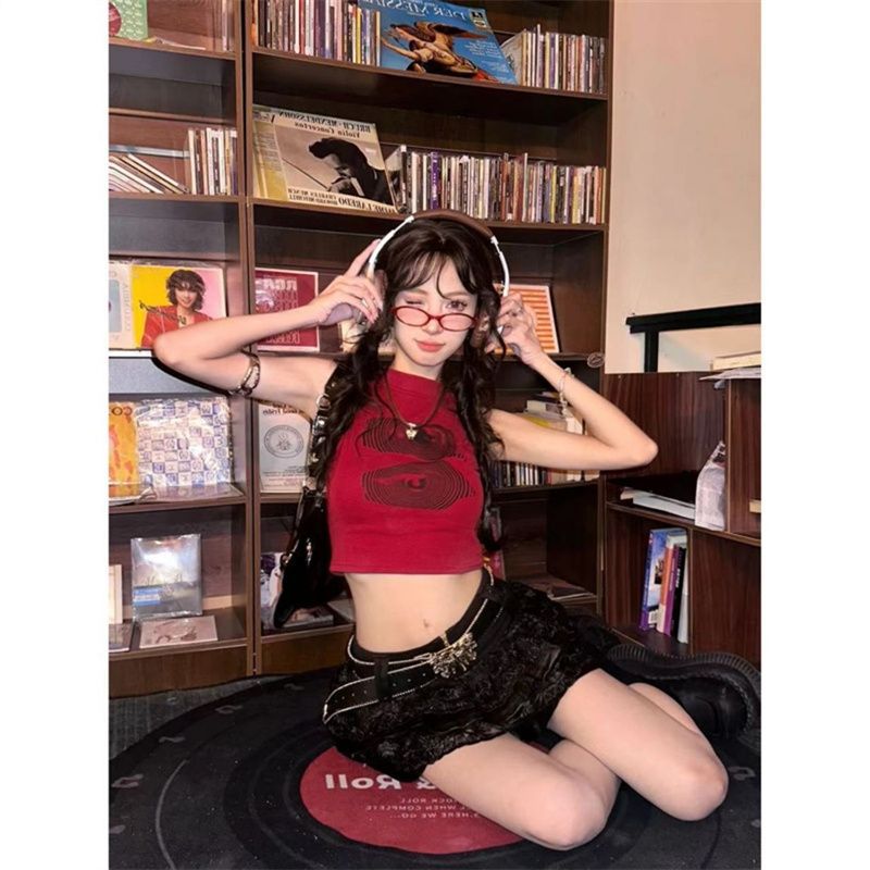 夏のレトロなホットガールスタイルのプリントハーフタートルネックベスト、女性用、ニッチなデザイン、スリムで多用途なショートトップ