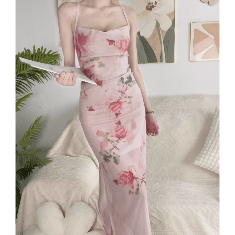 夏のセクシーなメッシュ花柄サスペンダードレスレディース甘辛スタイルスリットタイト痩身ボトムヒップカバーロングスカート