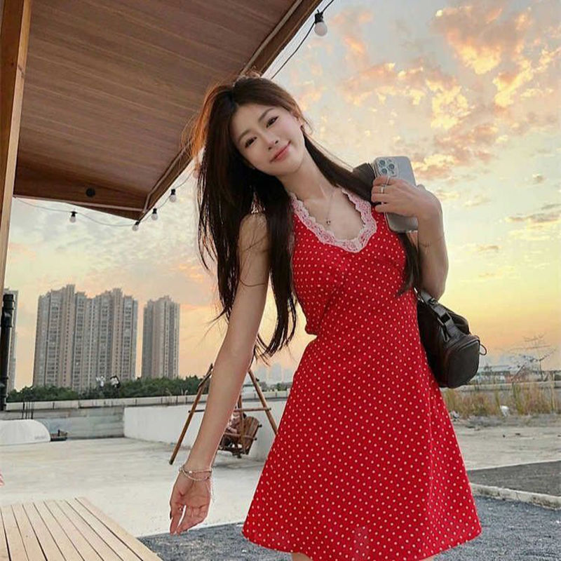 ファッションの洋気レースは赤いワンピースをつなぎ合わせます。
