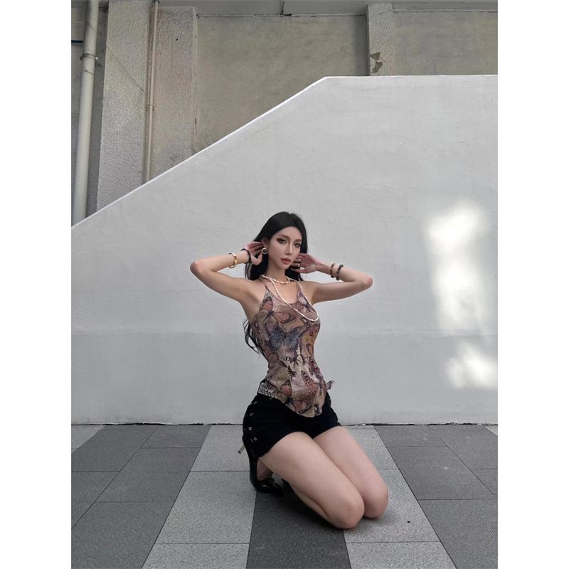 アメリカンレトロな蝶プリントメッシュキャミソールレディース夏アウターホットガールスタイルセクシーなスリムショートトップ