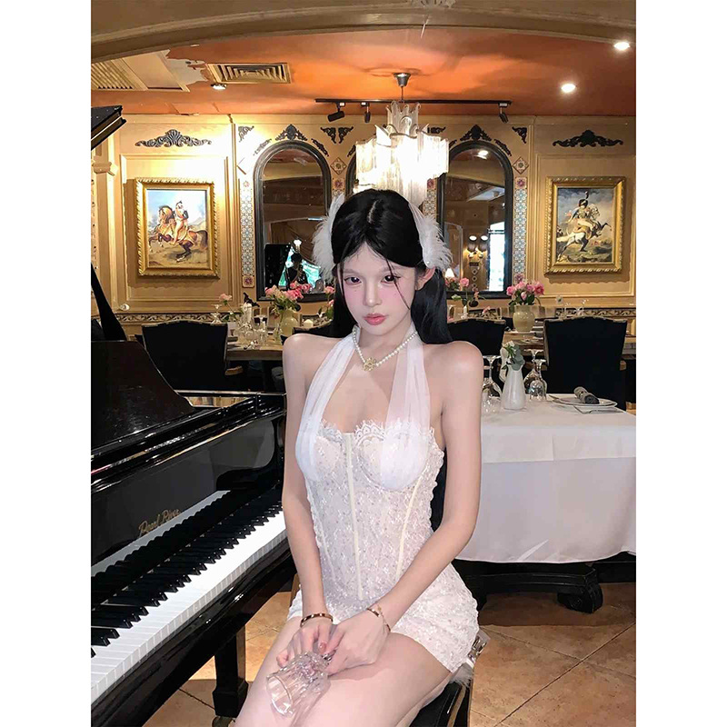 フレンチピュアセクシーレースチューブトップドレス女性用2025夏バックレスタイト痩身ヒップカバーショートスカート