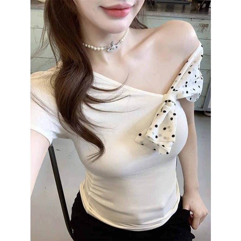 夏のリボンプリントワンショルダー半袖Tシャツレディース甘辛デザインスリムフィット万能ショートトップ