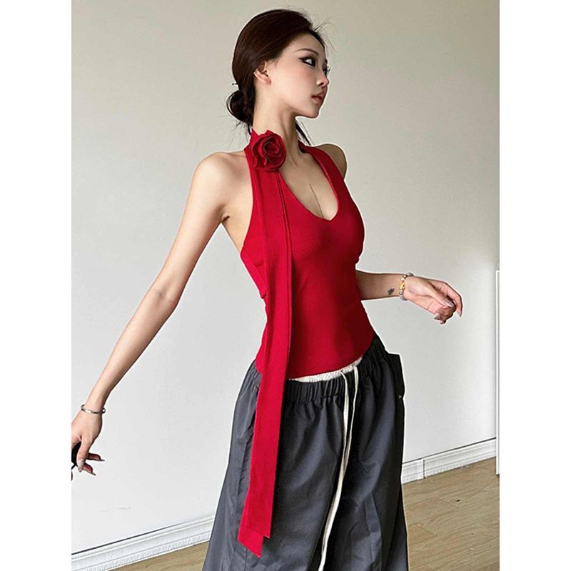 ファッショナブルでスタイリッシュな赤いセクシーなホットガールホルターネックノースリーブベスト女性の夏のデザインニッチスリムフィットインナートップ