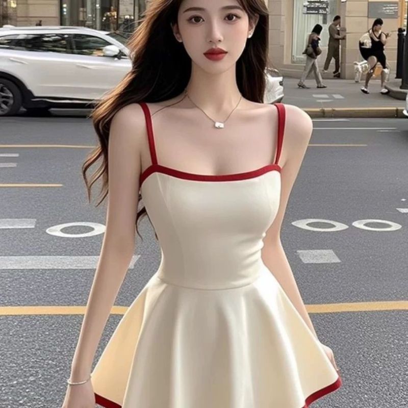 フレンチレトロピュアディザイアスタイルコントラストカラーサスペンダードレスレディース夏の新デザインウエストAラインショートスカート