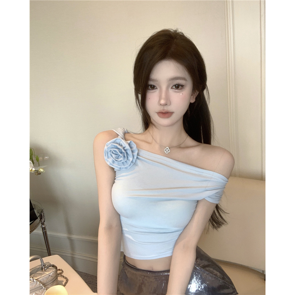 純欲風立体花斜め肩半袖tシャツ女性夏の不規則な臍を露出しています。