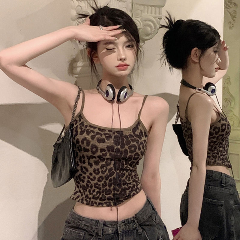 アメリカのギャルのセクシーな胸のキャミソールの女性の夏の2024の新型のヒョウの紋様の修身はやせている短い上着の潮を現します。