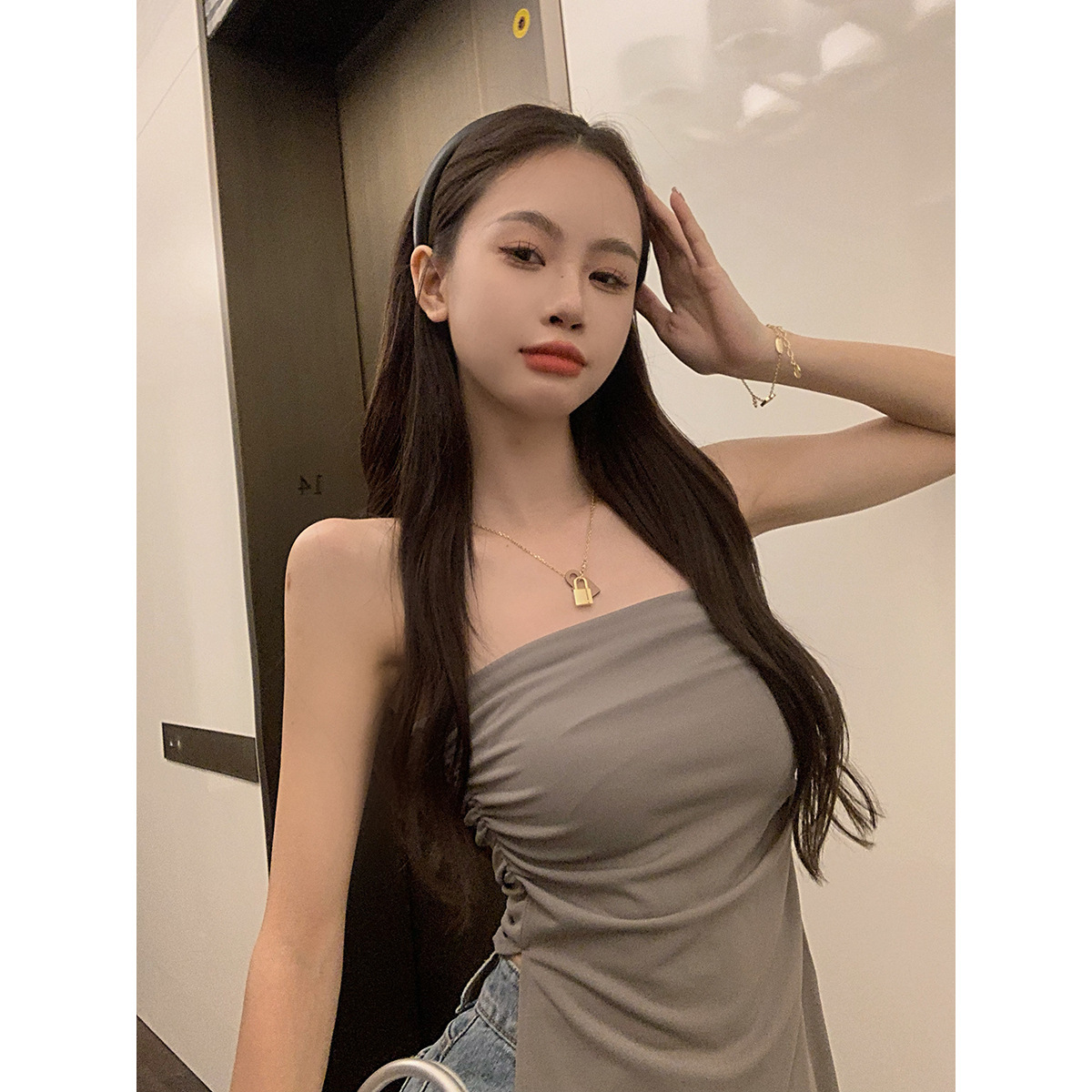 夏の新型の甘いギャルのセクシーな首のサスペンダーのベストの女性のデザイン感は背中を現して独特でやせている短い上着のファッションを現します。
