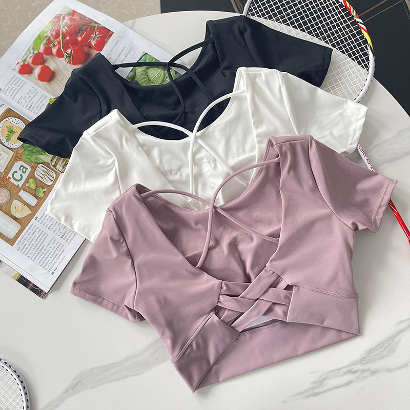 薄手のスポーツカジュアルベルト胸パッドヨガ服女性夏タイプセクシー美背もたれタイトなドライ半袖フィットネストップス