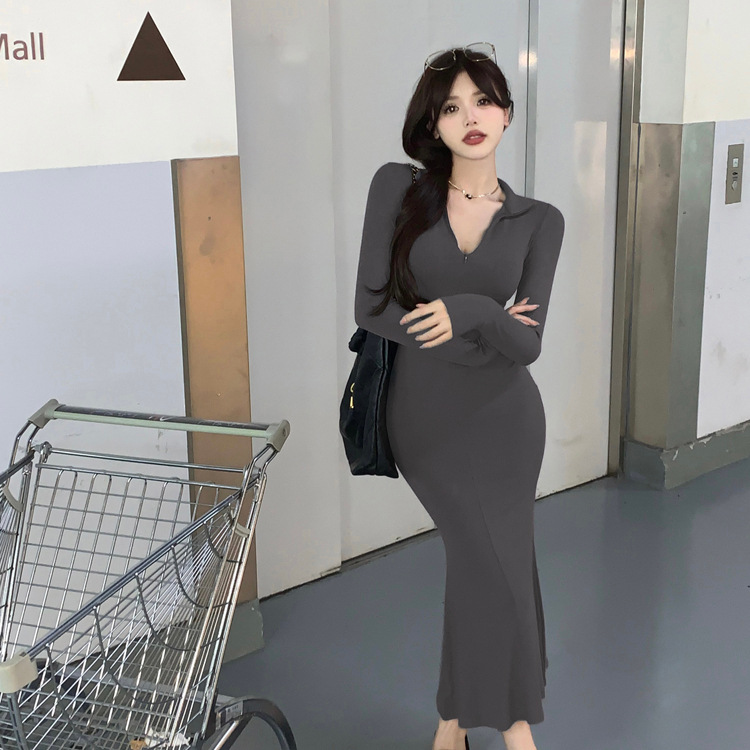気質ギャルのセクシーな胸の長袖のワンピースの女性の秋の新型の純欲風は身を修めて膝の魚の尾の長いスカートを過ぎます。