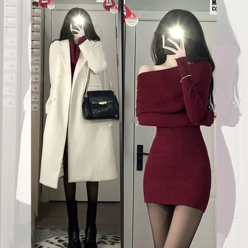 赤い洋風の一字の襟の肩の長袖のワンピースの女性の秋冬の新型の修身の中でファッションのお尻のスカートを包みます。