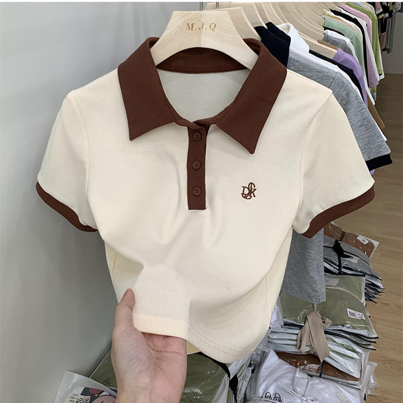 甘いギャルの小衆の刺繍poloシャツの女性の修身はやせている短い襟の上着の夏insのデザイン感の半袖のtシャツを現します。
