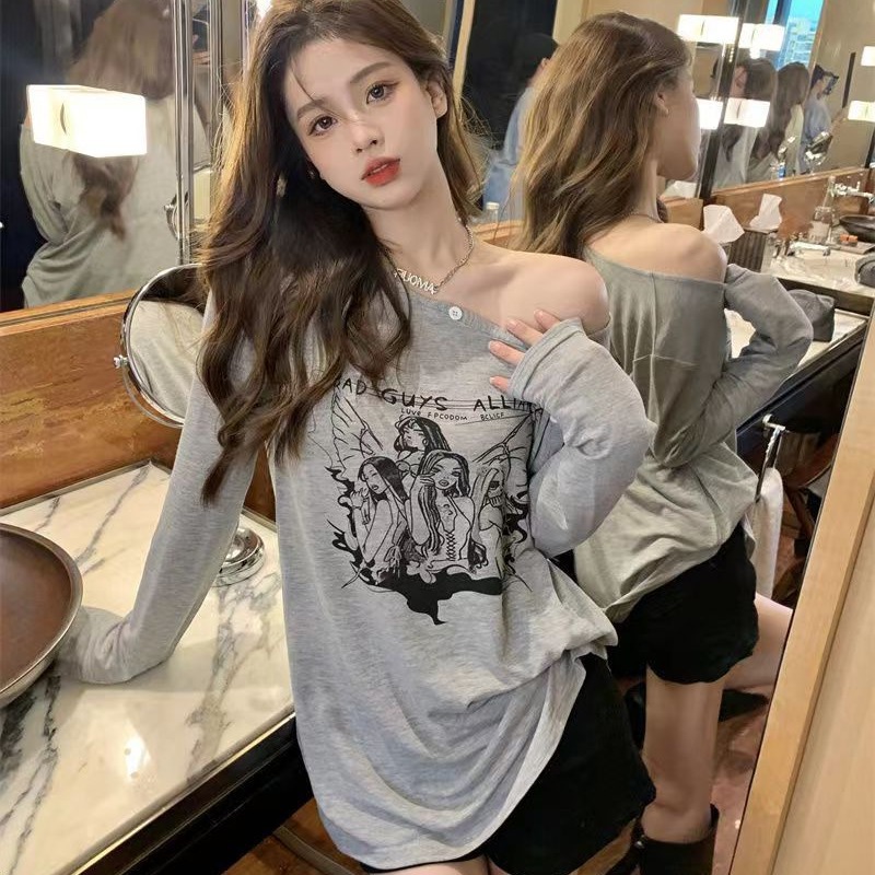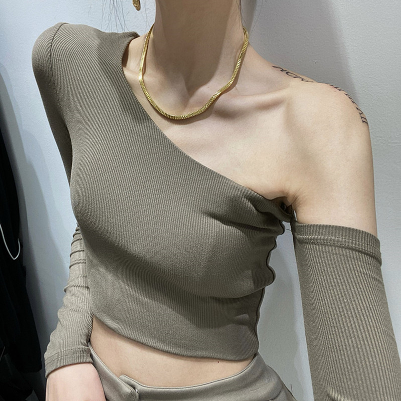 大衆のデザイン感斜め肩長袖tシャツ女性秋冬ギャルセクシーガードル