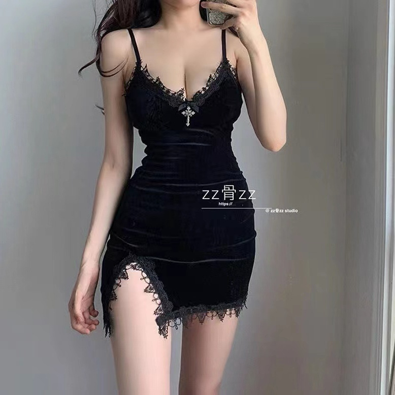 高級なベルベットの気質のストラップの胸のパッドのワンピースの女性の秋冬の新型の修身の中でセクシーな包みのお尻の中で長いスカートを掛けます。