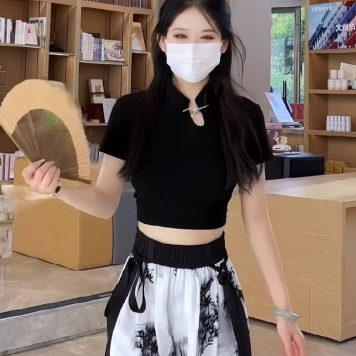 夏の新中国風黒正肩半袖tシャツ女性気質ギャルセクシー着痩せ改良チャイナドレス上着