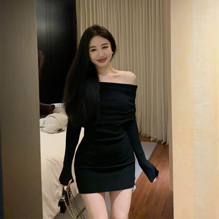 一字の襟の肩の純色の長袖のワンピースの女性の秋冬の新型の修身の外は心機のギャルを着てお尻の短いスカートを包みます。
