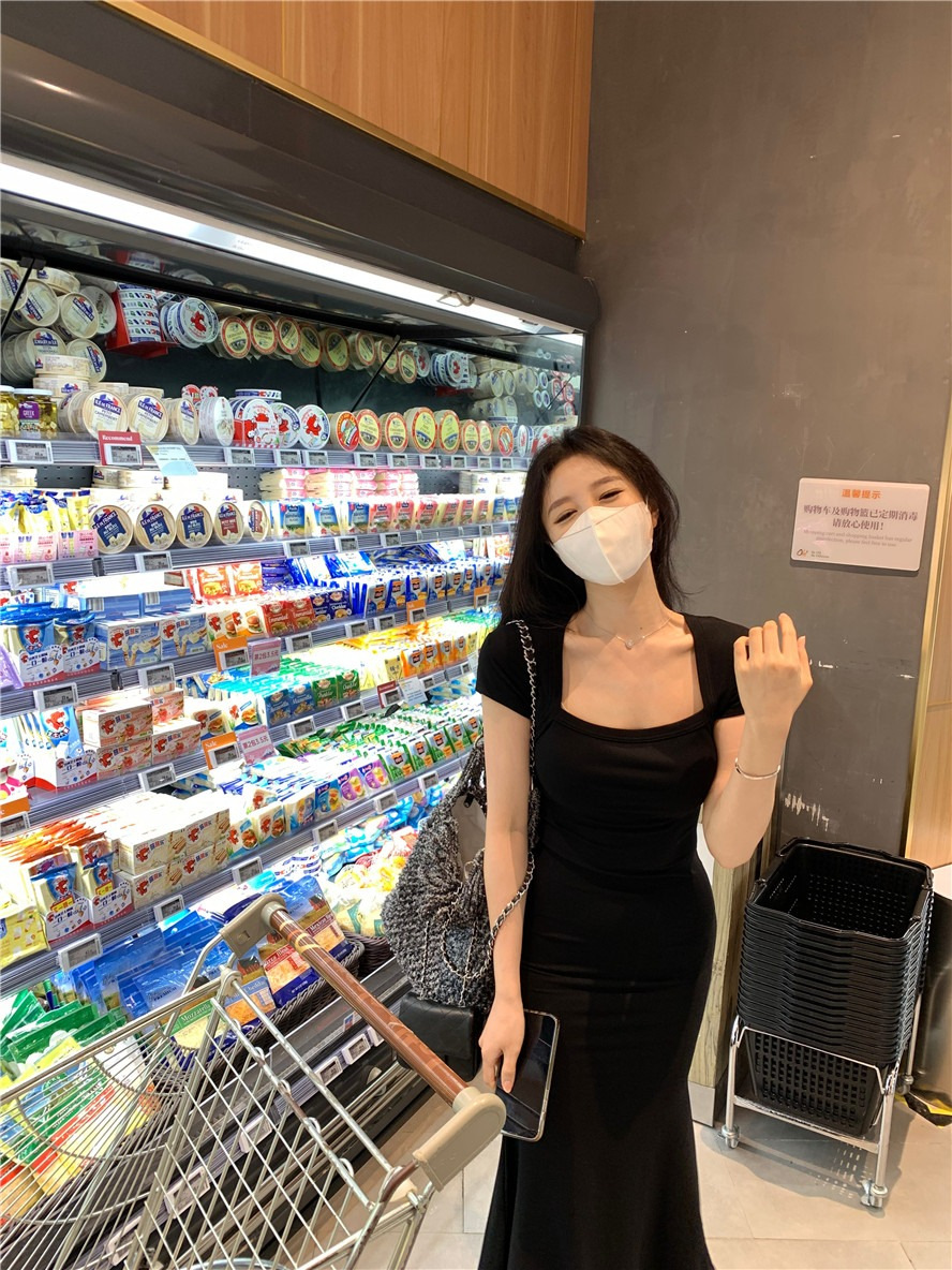 純欲風の方襟の半袖のワンピースの女性の夏の新型の鎖の骨の高い腰の黒色はやせていることができます。