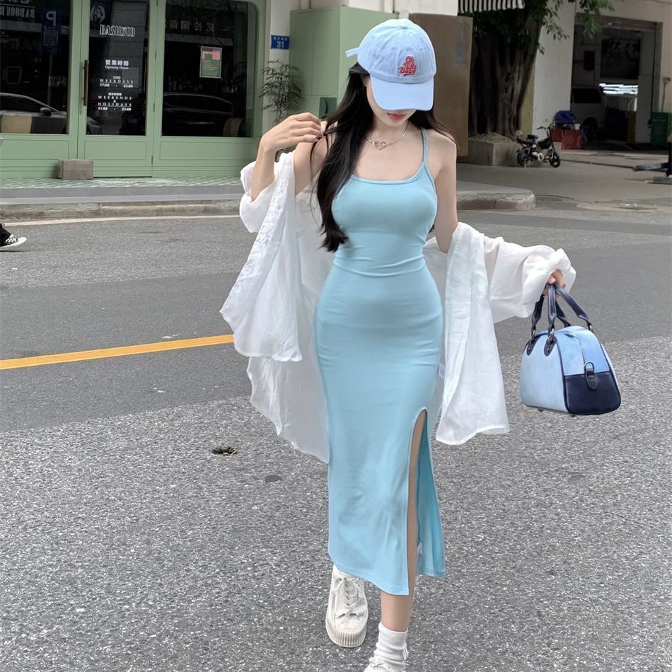 フランス式純欲風セクシーブルーストラップワンピース女性夏新作ハイウエスト高ノースリーブヒップロングスカート