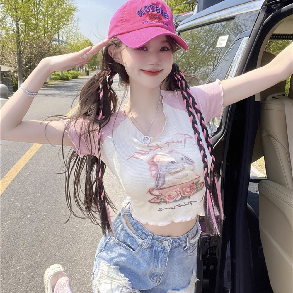 甘いクールな風の肩の袖のウサギのプリントの半袖のtシャツの女性の夏の木の耳元の短い金の修身の臍の減齢の上着