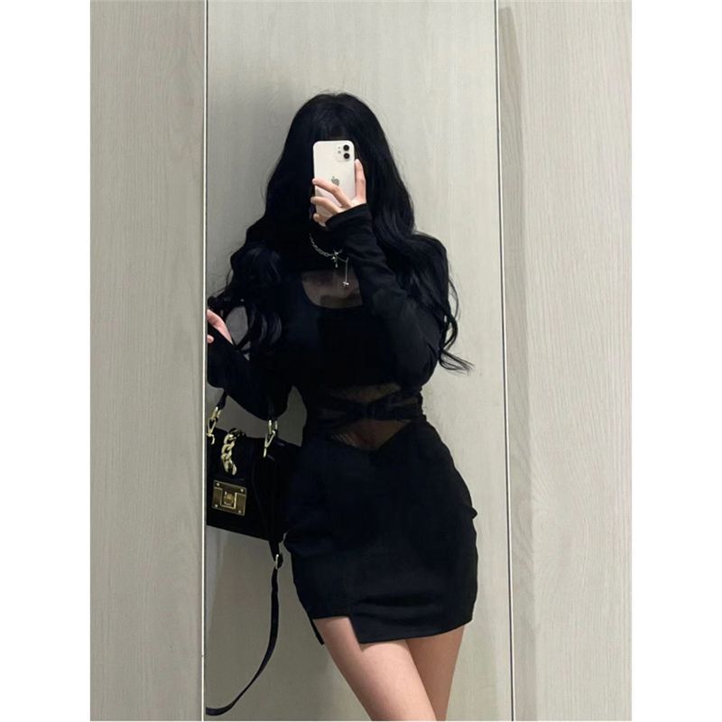 フランスのユニークなデザイン感のある網糸長袖ワンピース女性の春のギャルのセクシーなガードルの中にお尻のスカートを包んでいます。