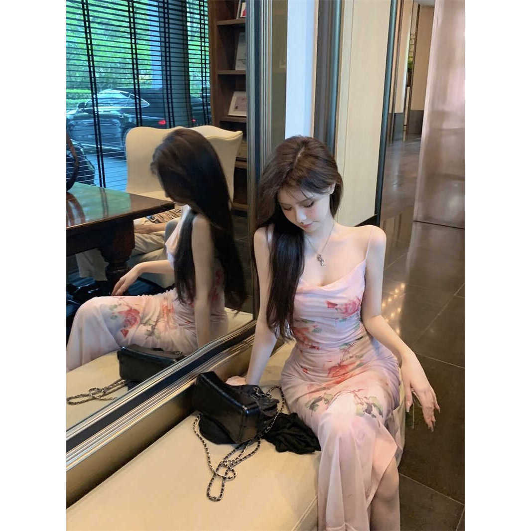ファッショナブルな純粋な欲望スタイルの花柄サスペンダードレス女性の夏の気質背中の開いたスリムフィットボトムヒップカバーロングスカート