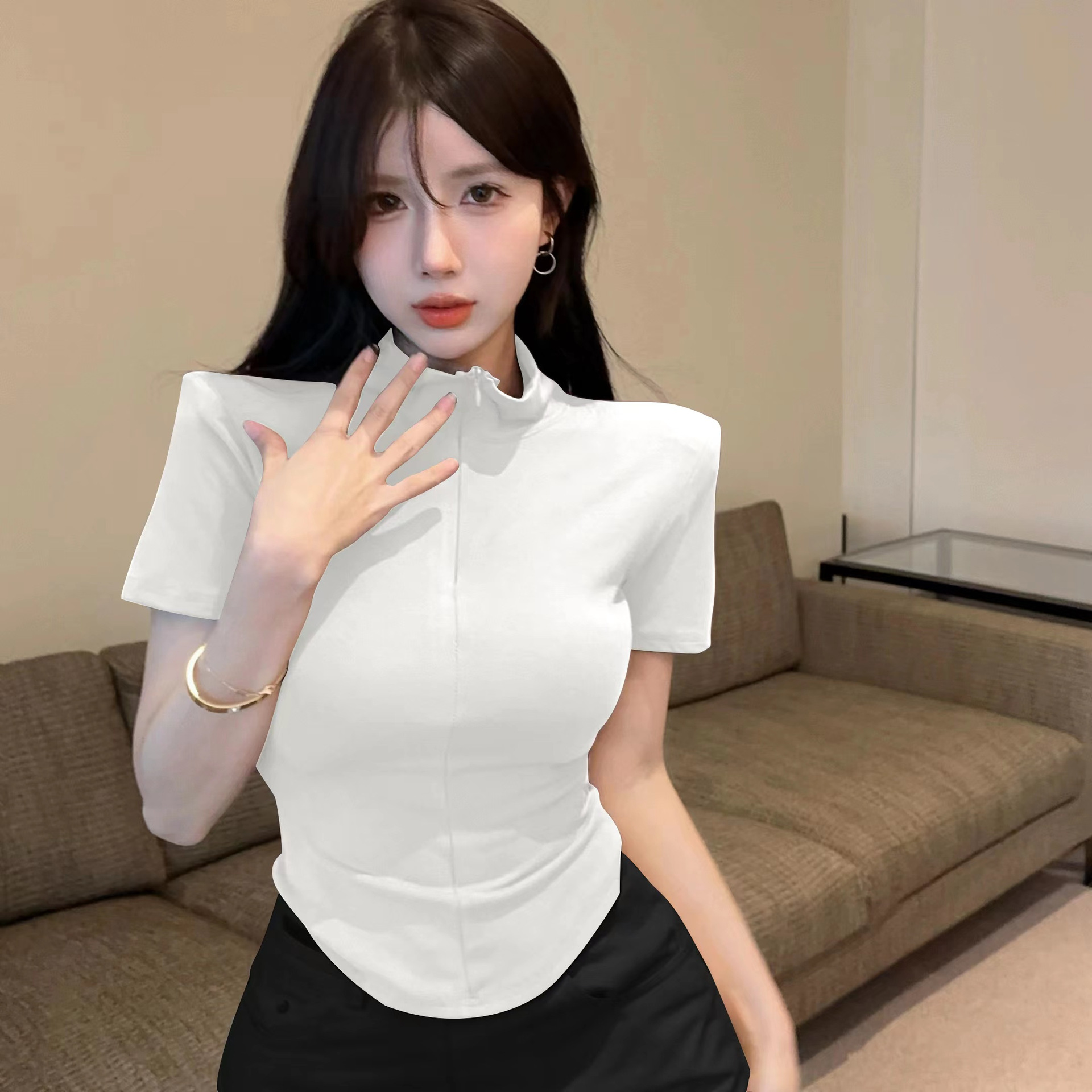 夏服純色シンプル半高襟半袖tシャツ女性ins百合正肩甘ギャル百合短金上服潮