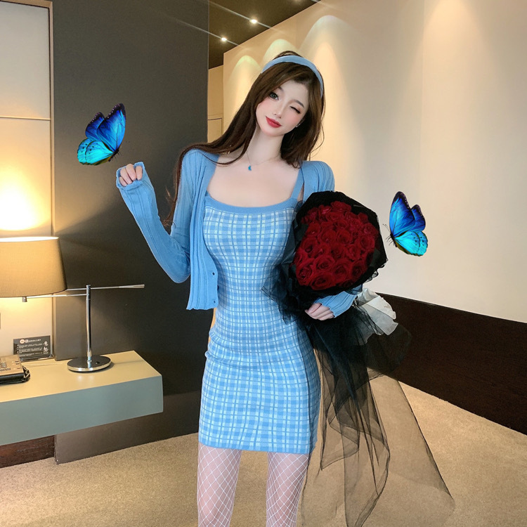 純粋な欲望の風の甘い青いストラップのワンピースの女性の夏服の新型のセクシーなギャルの気質は尻の格子の短いスカートを包みます。
