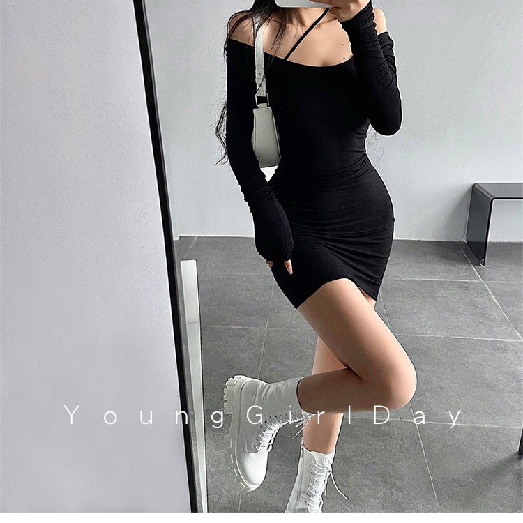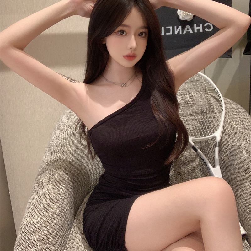 ギャルの斜め肩のストラップベストのワンピースの女性の夏の純欲な風の小さい体は年齢を減らします。