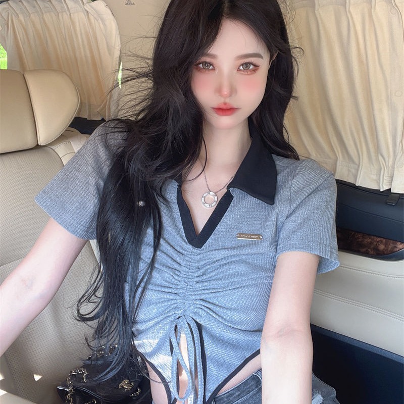 色のpoloの襟の紐のしわの半袖のtシャツの女性の夏の新型の短い肩のギャルの百合のファッションの上着