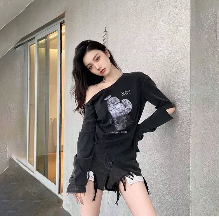 純綿の長袖tシャツの女性の新しいデザイン感の小さい大衆の不規則な肩の短いタイプのセクシーなギャルの純粋な欲風の上着