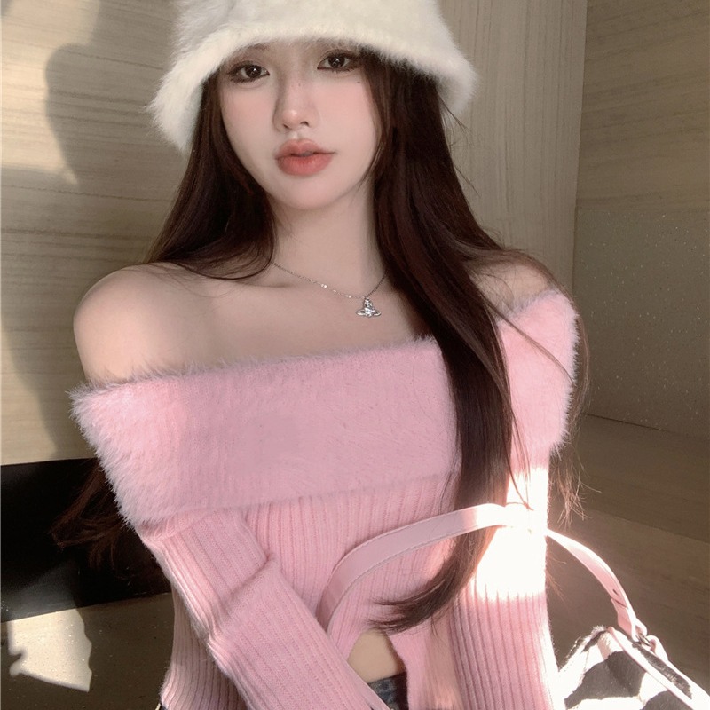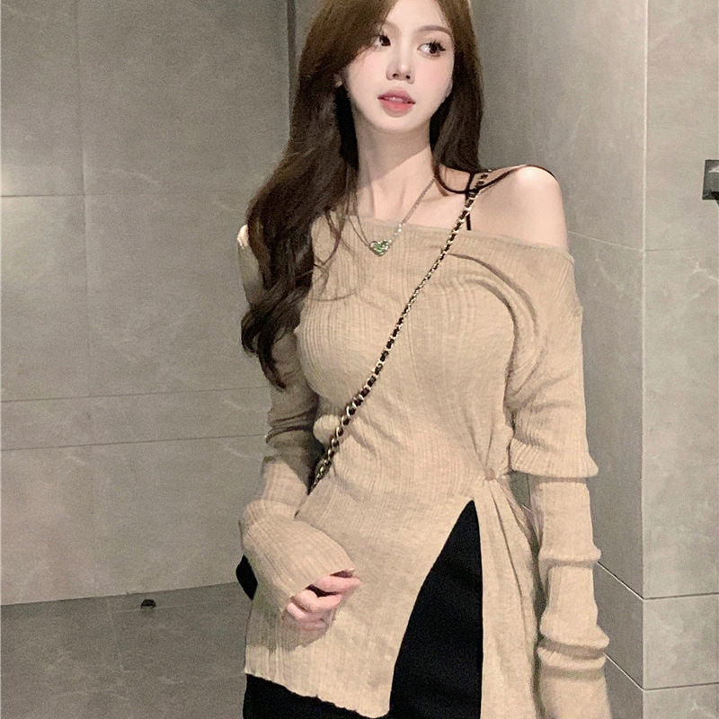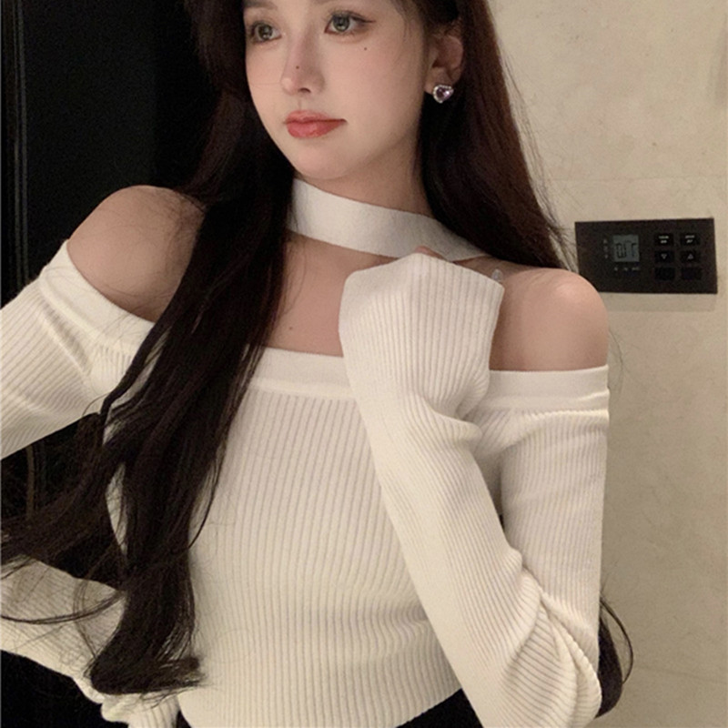純粋な欲風のデザイン感の一字襟の上着の女性2023春秋のセクシーな注意機は肩を露出して首を掛けて身を修める底のシャツを身に着けます。