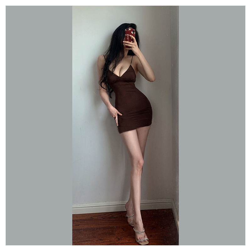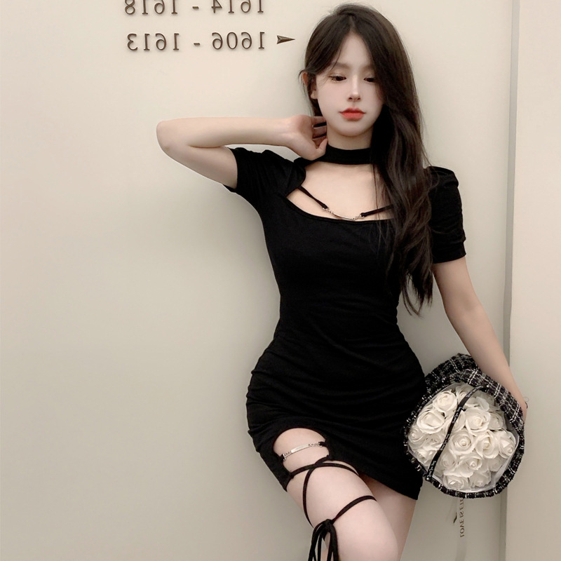 夏の純欲風ギャルのセクシーな透かし彫りのサスペンダーのワンピースの女性の独特なデザイン感が見えます。