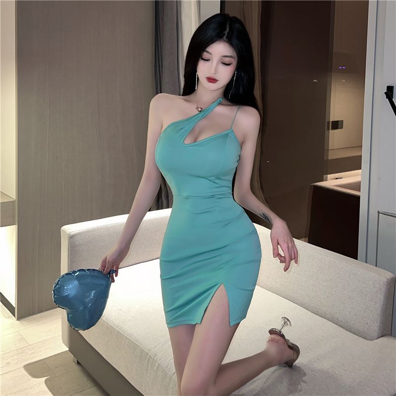 純欲風セクシーな首を掛けて胸のワンピースの女性2023夏の新型のガードルはやせている不規則なギャルのヒップスカートを現します。