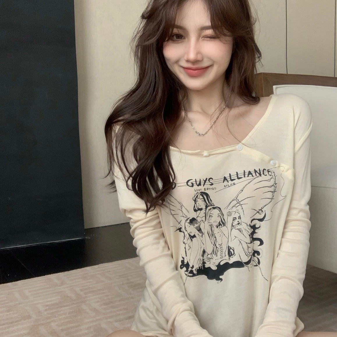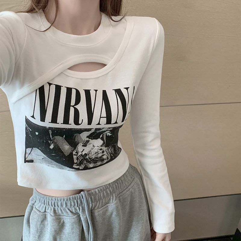 アメリカのデザイン感のある長袖tシャツの女性春と秋の新型のゆったりとしたカジュアルで辛いセクシーな肩の丸首の純綿の上着