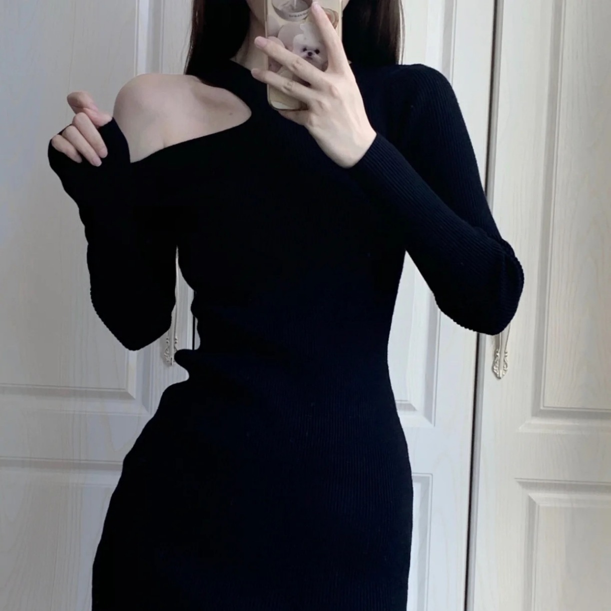 ギャルの斜め襟の長袖のワンピースの女性の秋の服の2023新型のセクシーな黒色の透かし彫りの腰の設計はお尻のショートスカートを包みます。