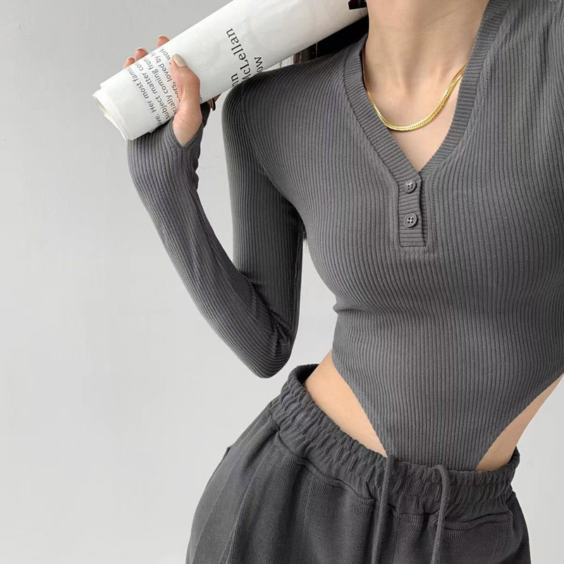 純粋な欲望の長袖のワンピースのtシャツの女性の春秋のセクシーなvネックのタイトな欧米のギャルは純色の底のシャツの上着を掛けます。