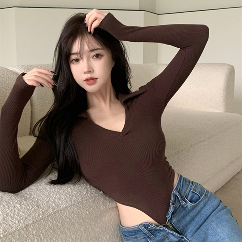 セクシーなタイトなtシャツの女性春秋2022新型のインナーシャツのギャルのショートタイプの臍の弾力性の長袖の上着