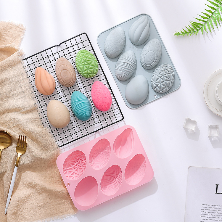 現物6連6種類のイースターエッグのカラフルな形のシリカゲル金型の祝日の卵焙煎皿ケーキ金型