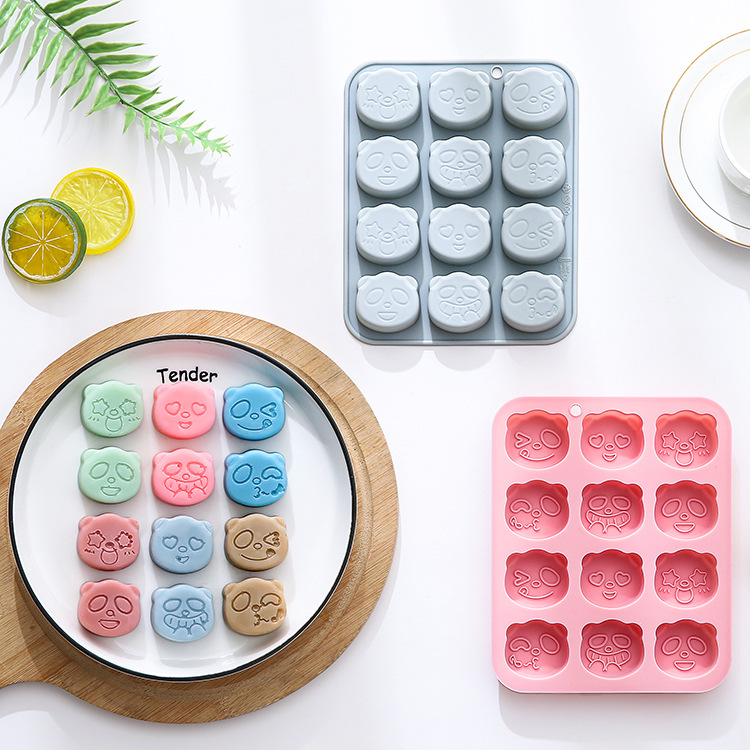 現物12連の異なる表情のパンダの形のシリカゲルの鋳型の漫画のケーキの鋳型のゴムの氷のチョコレートの鋳型