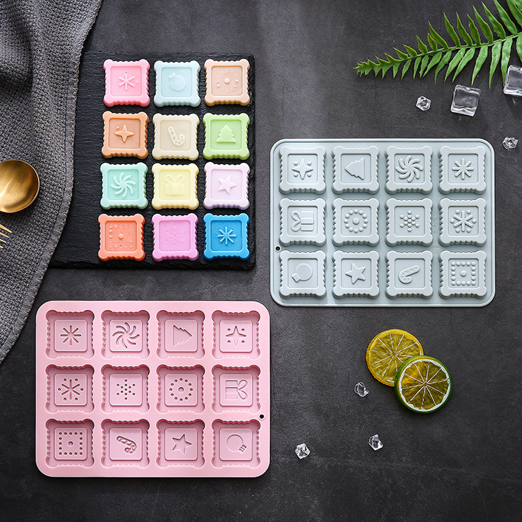現物12連の異なるクリスマスのテーマの四角形の板状のチョコレートの鋳型はケーキのシリコンの鋳型を焼きます。